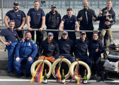 wunderbar. Sogar der Hinweis über die kurzzeitig ausgefallenen Zapfsäulen kam von einem der Teichmänner! Auch hier bedanken wir uns, denn genau zu dem Zeitpunkt war der erste Fahrerwechsel geplant. Wir konnten das gesamte Rennen entspannt absolvieren und unseren Motor schonen. Allerdings wurde es in der Letzen Runde dann doch noch mal hektisch, denn die beiden Gesamtführenden schlossen auf und ich unterrichtete unseren Schlussfahrer Michael Bohrer über Funk wo sich das 2er Gespann hinter ihm auf der Strecke befand. Kurz vor Ende der Döttinger Höhe, schossen die beiden BMWs an uns vorbei. Ich hatte Michael gebeten sich so klein wie möglich zu machen… Aber auflösen konnten wir uns nicht.“ Ebenfalls zur Top-Teamleistung beigetragen hat natürlich die klassische Samstagsbolognese von unserer Mutti Elke, sowie dem unermüdlichen Einsatz jedes einzelnen Teammitgliedes!